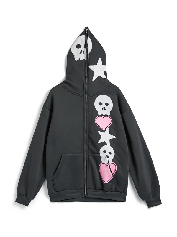 Men’s Street Skull Star Heart Print Full Zip Oversized Hoodie