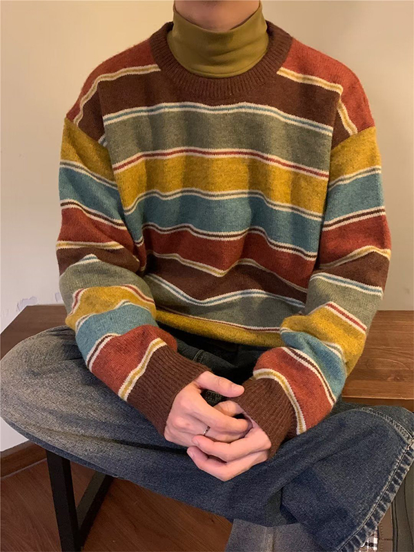 Men’s Vintage Rainbow Striped Crew Neck Sweater