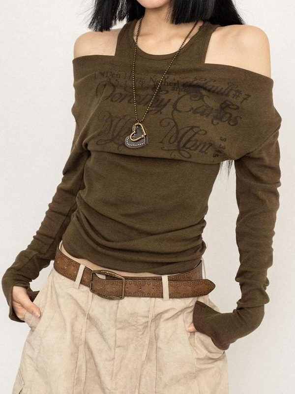One Shoulder Fake Two Piece Print Long Sleeve Tee
