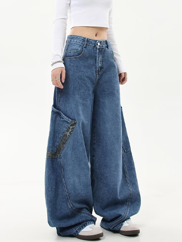 American Retro Leopard Print Stitching Boyfriend Jeans