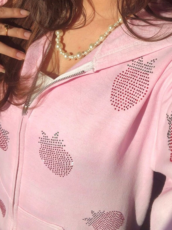 Strawberry Rhinestone Print Zip Up Oversized Hoodie