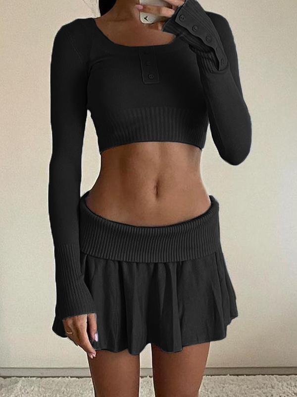Solid Color Breasted Crop Turned Waist Knit Two Piece